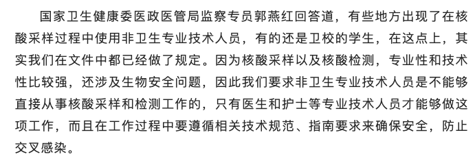 此前,发生过天水卫校本科生上前线采集核酸被感染的案例。国家卫健委在回应这起案例时表示,核酸的采样和检测专业性和技术性都比较强,还涉及生物安全的问题,非卫生专业技术人员不能直接从事核酸的采样和检测工作。