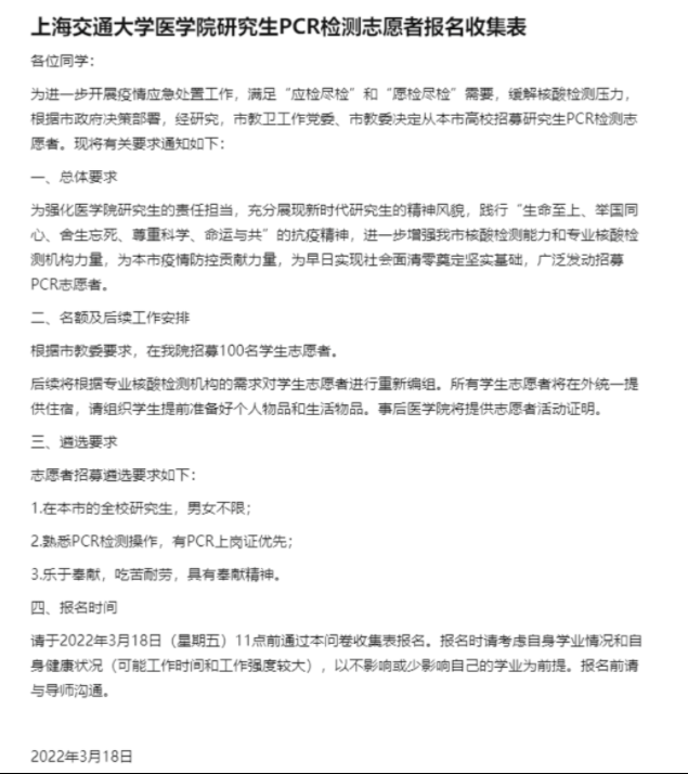 3 月 18 日晚,上海市教卫工作党委、市教委向各大高校,科研院所发布通知,招募熟悉 PCR 操作的志愿者支援一线核酸检测工作。