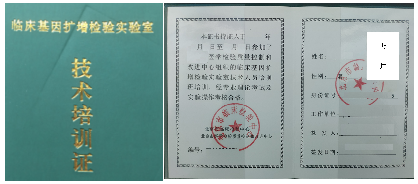 指南中提到的基因检验相关培训证书,指技术人员经省级以上卫生行政部门指定机构组织的技术培训后,通过理论和技能考核获得的 PCR 上岗证。考核形式包括理论考试和技能考核,考核内容包括生物安全,标本提取,加样,基因扩增和结果判读等内容。