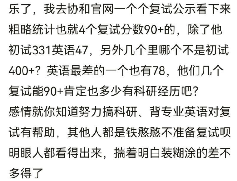 很快,网友们找到了其他可以质疑的点:根据协和官网发布的复试名单,陈鑫的专业课分数并不算低;但他的英语只有 47 分——而他的对手英语有 70 分。一瞬间,陈鑫仿佛已然被定罪:「连考研英语分数这么低,怎么可能发 SCI 呢?」