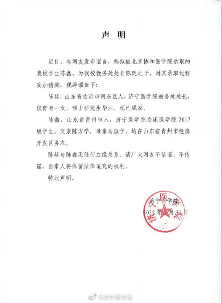 图片来源:协和官网公示复试名单截图更有甚者,好事的目光投向了陈鑫的出身院校,济宁医学院。很快,他们盯上了济宁医学院教务处处长的名字——同为陈姓、校内高管。似乎又是一切都「说得通」了:肯定又是老子保儿子的走后门「常规操作」!