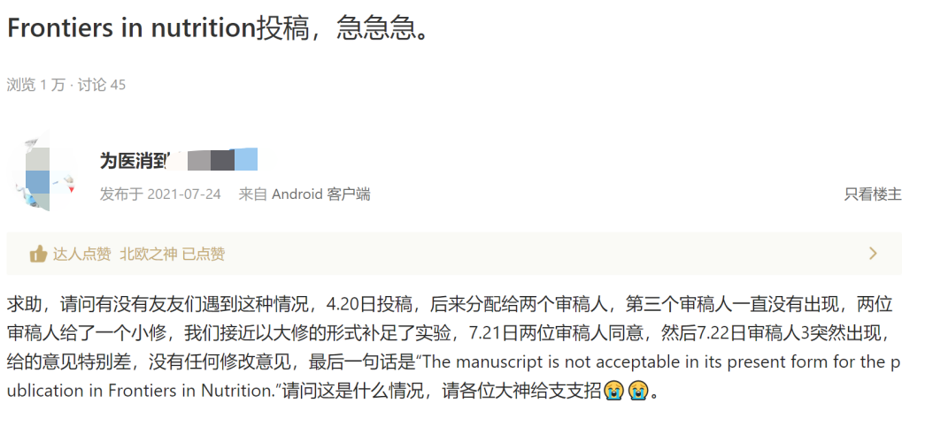 而关于 SCI 论文写作的问题,有网友甚至扒出了陈鑫论文写作期间,在丁香园论坛上从提问求助到论文最终发表全过程的帖子 —— 字字句句恰好真实地记录了一位科研人在发论文时的心焦和努力。(点击下方「查看原文」可查看丁香园原贴讨论链接)