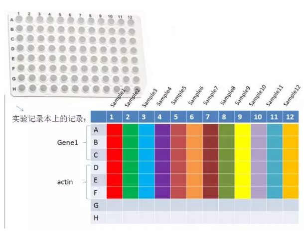 有些小师妹怕自己加样搞混,喜欢在 PCR 板上划出标志,这样做是不对的。因为你的标记极有可能影响到荧光信号的采集,所以一般我会建议师妹采用实验记录本协助记忆,如下所示。
