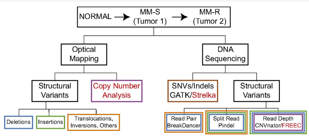 在本研究中,研究者提出了一种单分子、全基因组分析系统——OGM 的应用,以发现原发性 MM 基因组中新的结构变异。通过分析,研究者确定和表征了的肿瘤基因组中广泛的结构变异。此外,通过整合 OGM 与基于 DNA 测序的基因组分析的结果,全面表征了基因组结构和变异。