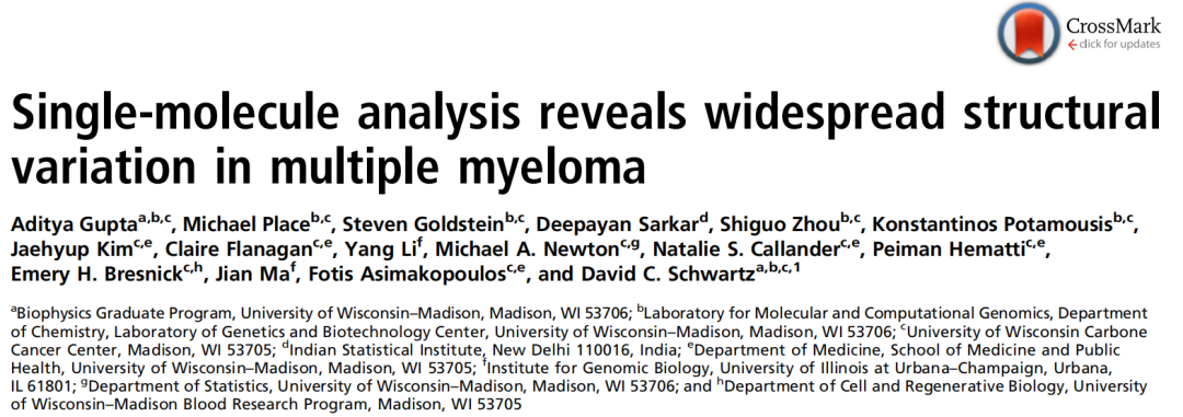 而发表在 PNAS(五年平均 IF = 12.29)的这篇研究:Single-molecule analysis reveals widespread structural variation in multiple myeloma 中,研究者提出了一种使用全基因组光学图谱(Optical genome mapping,OGM)技术和 DNA 测序的综合方法,以全面鉴定来自多发性骨髓瘤患者的序列样本中的基因组结构变异[1]。
