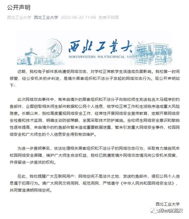 6月22日,工业和信息化部直属985大学,中国唯一一所以同时发展航空、航天、航海工程教育和科学研究为特色的全国重点大学——“国防七子”之一的西北工业大学发布公开声明: