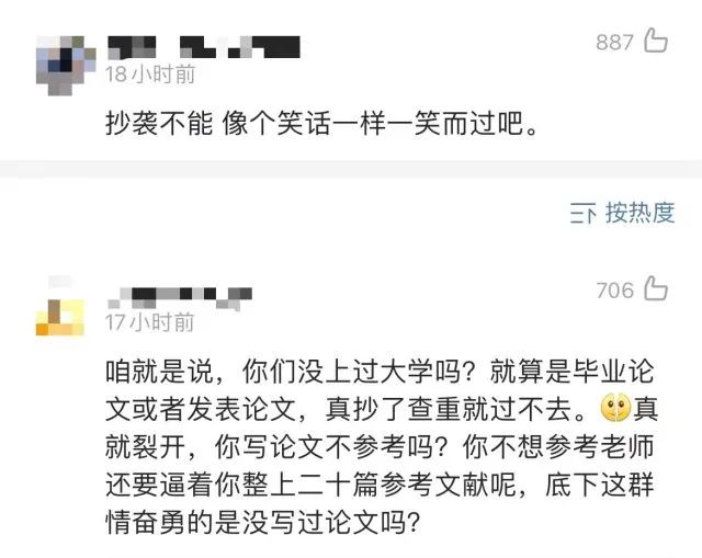 学霸君又往下翻了翻,还是也有不少网友感觉到,这种事确实不好嘻嘻哈哈给全世界分享,整得好像在给抄袭行为评个年度十大光荣榜似的。合着抄袭完了再给你个优秀呗?