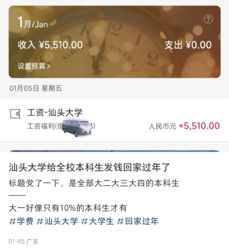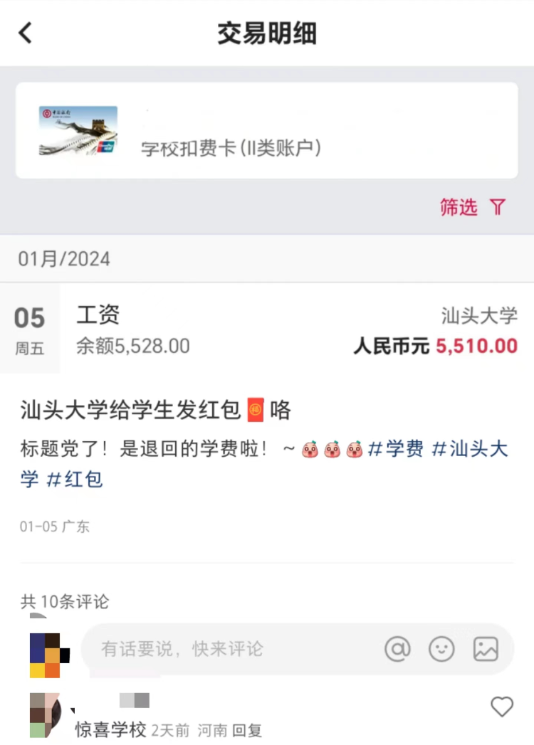 据多位汕头大学学生介绍,这笔款项来自李嘉诚基金会的学费全额奖励计划,2019 级至 2022 级学生四年免学费,「在考试月收到这笔款项,感觉心里暖暖的。」