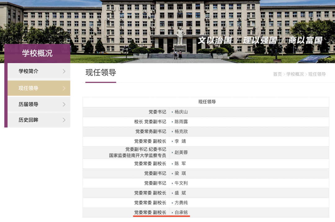 1 月 9 日,南开大学官网发布消息:日前,上级决定,白承铭同志任南开大学党委常委、副校长(试用期一年)。