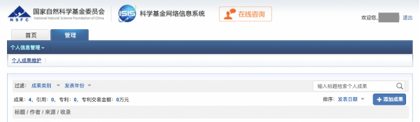 登录进系统后,上方和左侧都可以点击「个人成果」进行个人成果的查看和维护。