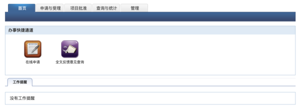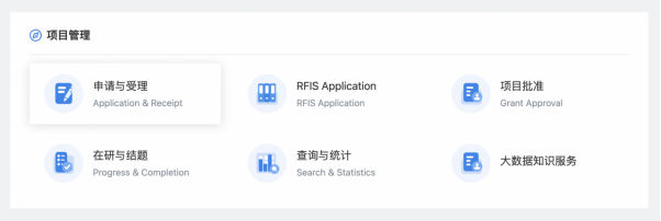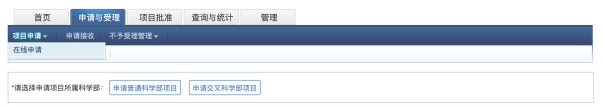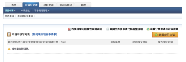 项目申请的入口在登录进系统后很显眼,放在「项目管理」的第一位:申请与受理。如果没有生成科研简历,需要先生成,才能进入这个版块。