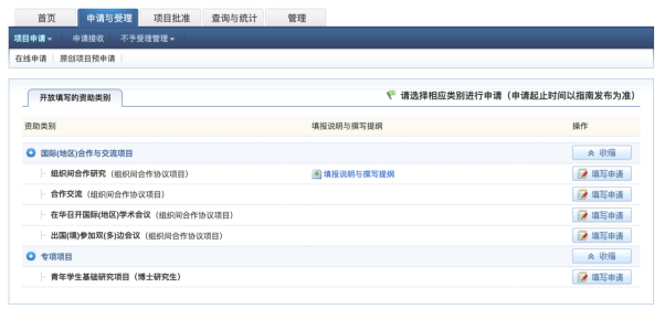 选择完毕后,就能看到申请人所能申报的项目类型。选择对应的项目,点击「填写申请」,进入申请书填写界面后即可完成线上申请。