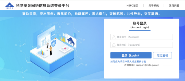 接下来就是使用国自然官方提供的在线申报系统(https://grants.nsfc.gov.cn/pmpweb/login)提交申报书,按照提示和要求填报即可。如果没有账户,申请人需要先向依托单位科研管理部门的相关负责人联系申请开户。