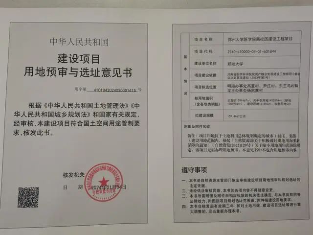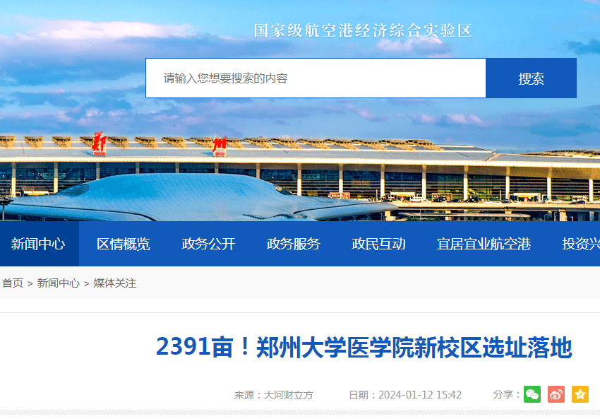 1 月 12 日,郑州航空港官网显示,近日,郑州大学医学院新校区建设工程项目用地预审与选址意见书批后公示。