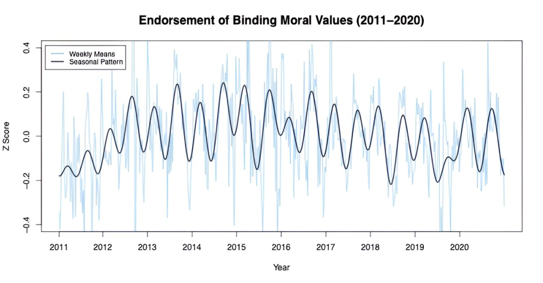 2011 年到 2020 年间,人们对忠诚、权威和纯洁等具有约束力的道德价值观的认可度会出现规律性的季节性波动。