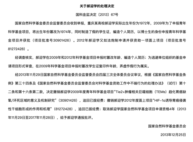 可终究法网恢恢疏而不漏,立项第二年就被国自然基金委查出来,两个项目撤销,追回已拨经费。郝某被通报批评,取消项目申请资格 4 年。