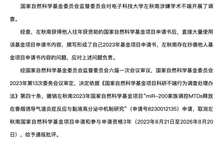 被通报批评后,他被撤销了已经立项的面上基金,已拨经费也被追回,还取消 5 年项目申请资格。