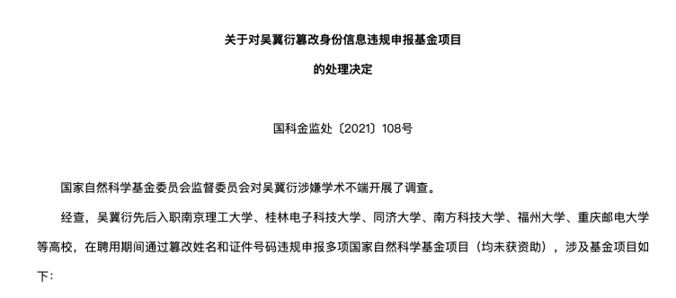 吴某在 2019 年和 2020 年先后入职南京理工大学、同济大学、南方科技大学等六所高校,其间通过篡改姓名和身份证件号码,违规申报六项国自然基金项目,均未获立项。