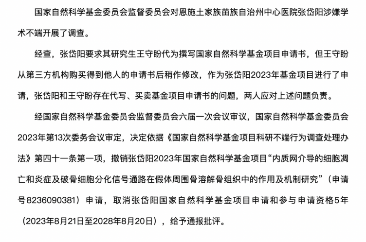 学生感觉写不来,就从网上买了份别人的申请书,稍作修改后进行申请。俩人被基金委查到,导师张某被通报批评,并被取消 5 年的申请和参与资格。