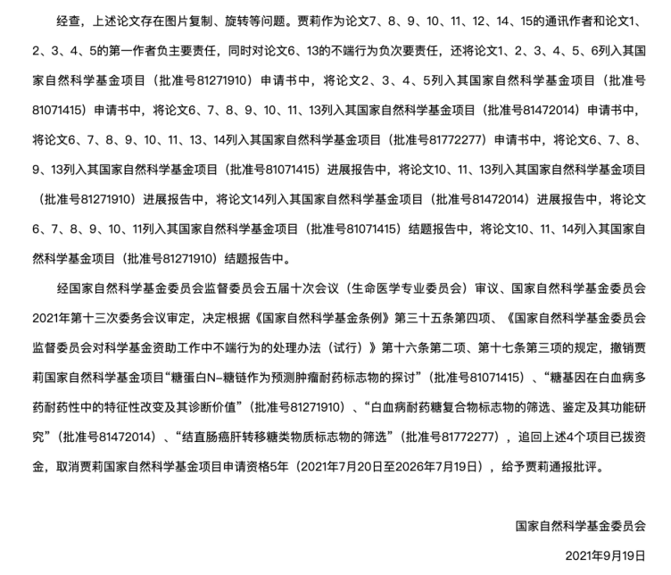 2021 年,国自然基金委查明事实,对贾某通报批评,撤销四个立项,追回已拨资金,并取消其基金项目申请资格 5 年。