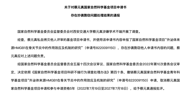 西安交通大学的新进教师蔡某,把同事评审的申请书偷偷拷贝来,抄到自己申请书里,被基金委通报批评,并取消 5 年项目申请和参与资格。