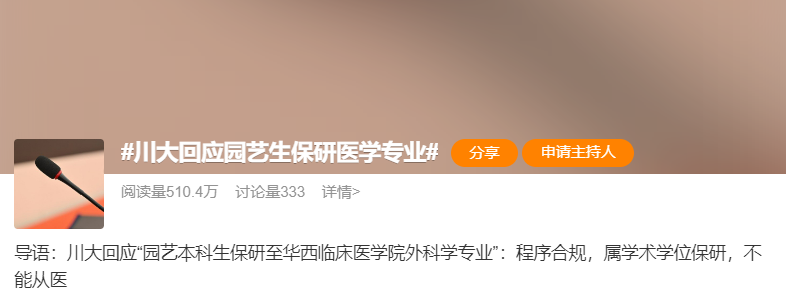 近日,四川农业大学公众号发布的一则文章引发关注、热议,文章称,该校一名学园艺的本科生保研至四川大学华西临床医学院外科学专业。此消息引发关注,不少网民觉得不可思议。12 日下午,四川大学研究生院招生办公室回复纵览新闻,经了解,这名学生跨专业保研程序合规,属于学术学位保研,不能从事医生行业。