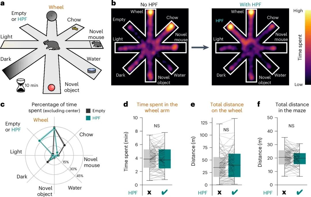 研究者将小鼠放置在八臂迷宫中,观察其在面对不同选项(如跑步轮、高诱惑食物等)时的行为。结果显示,小鼠在有高诱惑食物(HPF)存在时,跑步轮的使用未受影响,但其进食时间显著减少。通过腹腔注射食欲素受体拮抗剂,研究表明,食欲素神经元在选择运动与食物之间起到了权衡的作用。实验结果还表明,尽管 HPF 诱惑显著,运动仍然被大脑优先考虑。