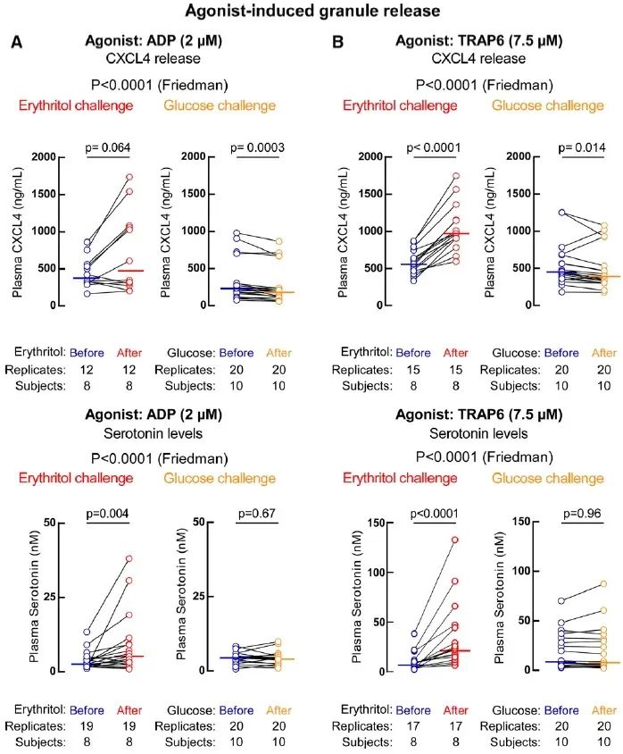 研究者评估了赤藓糖醇和葡萄糖摄入对健康志愿者刺激依赖性血小板反应的影响。结果显示,摄入 30g 赤藓糖醇使其血浆浓度增加超过 1,000 倍,并在所有受试者中引起急性增强的血小板聚集反应。同时,赤藓糖醇的摄入显著增加了血小板释放的血清素和 CXCL4 标志物,而葡萄糖则没有这种效果。这表明,赤藓糖醇的摄入可能增强血小板反应性,从而增加血栓形成的风险。