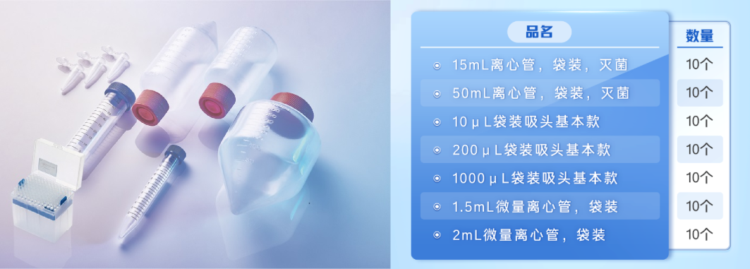 液体处理类耗材礼包(含 9 个型号离心管系列、移液系列产品) ;