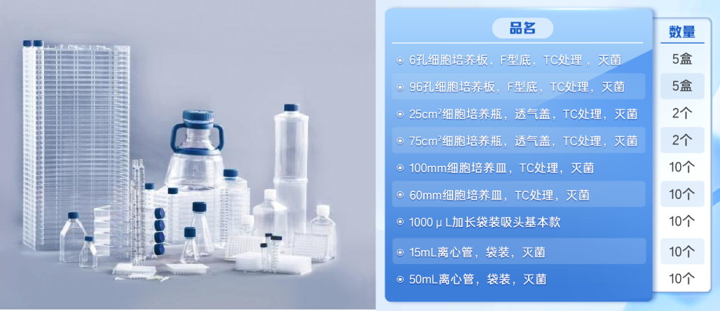 细胞培养系列耗材礼包(含 9 个型号份细胞培养板、细胞培养瓶系列产品)。