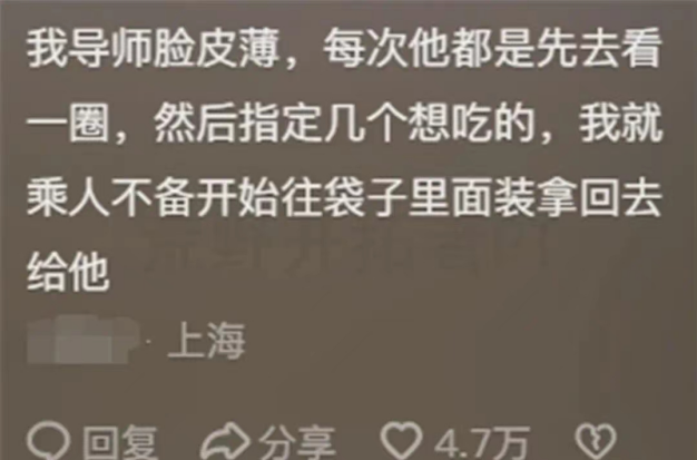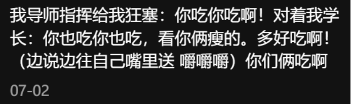 导师:不是不想吃,主要是熟人太多不好意思上去抢,懂?你:收到,over。马上趁人不注意,打包装袋拿给他吃。当然,也有明着从学生手里争抢茶歇的导师。