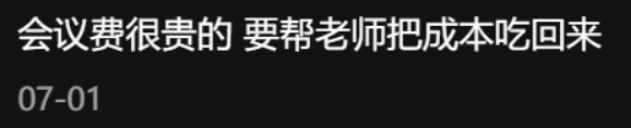 再者说我这个吃,它的目的显然不是单纯地为了吃,背后想必还有更深层次的原因——会议费很贵,一定要帮老板把成本吃回来。你想想,参会一次人均成百上千的费用,我要是不使劲吃回本,那我导的经费不就白白浪费掉了吗,我这都是心疼 ta !背后原因属实令人暖心��