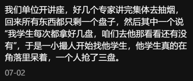图片来源:小红书而随着「蝗虫」越来越多,吃茶歇的技术也开始与时俱进。一只「学术蝗虫」每次只能抢到一盘茶点,但若是一群「学术蝗虫」分工明确,好好配合,有的负责连装带拿,有的负责应付旁人,有的负责猛吃大喝 …… 那学霸君只能说,终于知道每次参会都吃不着的新鲜水果究竟都跑哪去了。