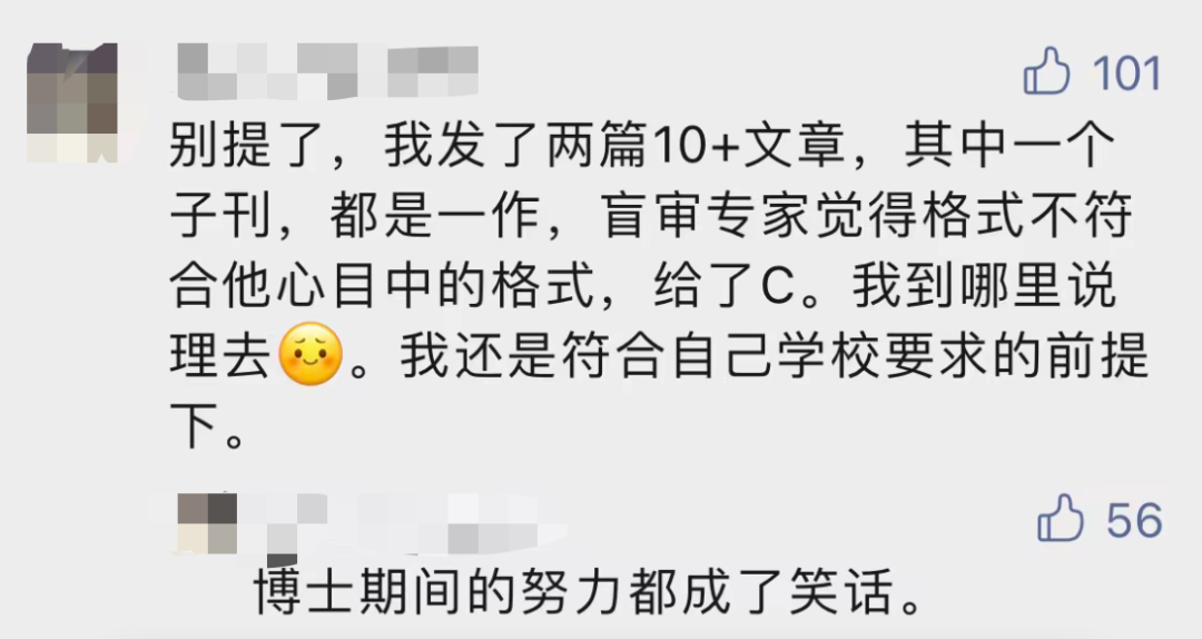 而另外一个悄悄变严格的关卡就是盲审,重复率有客观指标,至少改起来还有迹可循。但作为答辩前最后一步的盲审,不仅完全来自于外审专家的主观看法,还拥有着残酷的一票否决权——博士论文需要三名专家的意见,只要有有一个打分不合格,基本就面临延毕。