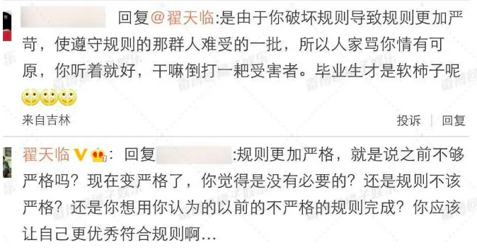 网友指出由于他破坏了规则导致规则更加严苛,翟天临丝毫不服气,几度回怼:「规则更加严格,只能说明之前不够严格?」