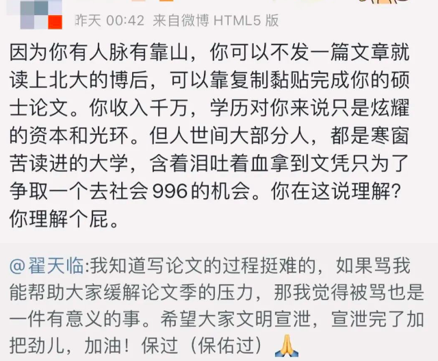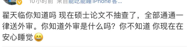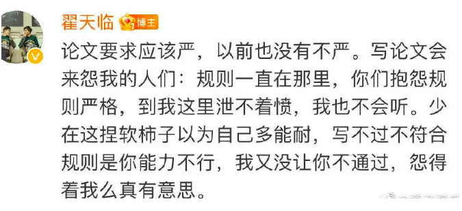 没想到,忍了 4 年的翟天临,昨天终于大破防,在评论区愤怒回怼网友:「论文不通过是你自己能力问题,怨得着我吗?规则一直在那里,到我这里泄不着愤,我也不会听。」