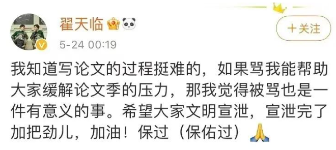 只是在面对难解的毕业压力时,改变不了游戏规则的毕业生,终于在茫茫的赛博世界找到一个抱团取暖的地方——甚至还给翟天临贡献了稳定的热度,他应当感谢才是。