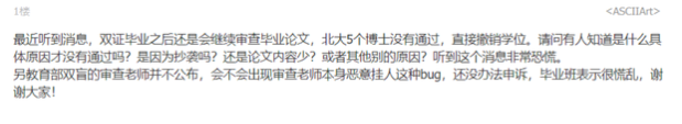 图片来源:未名 BBS |北大 5 博士毕业后又被撤销学位,只因毕业论文二次审查未通过因此,自 2019 年后的每一年都被调侃为「史上最难毕业季」,影响力巨大的「不知知网」事件就是这场雪崩中最为瞩目的那一片雪花。